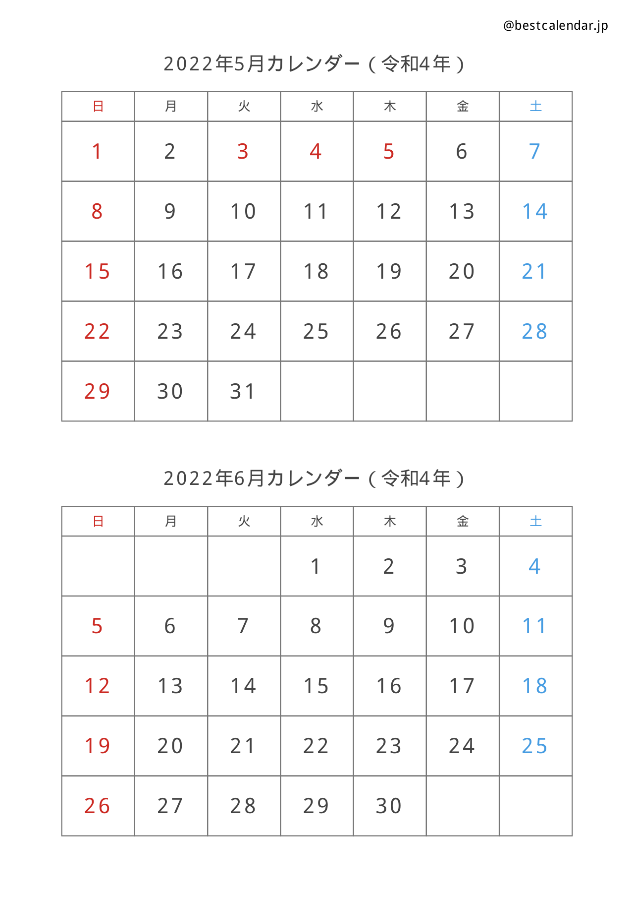 2022年5-6月の2ヶ月分を1枚にまとめたA4縦向きカレンダーです。