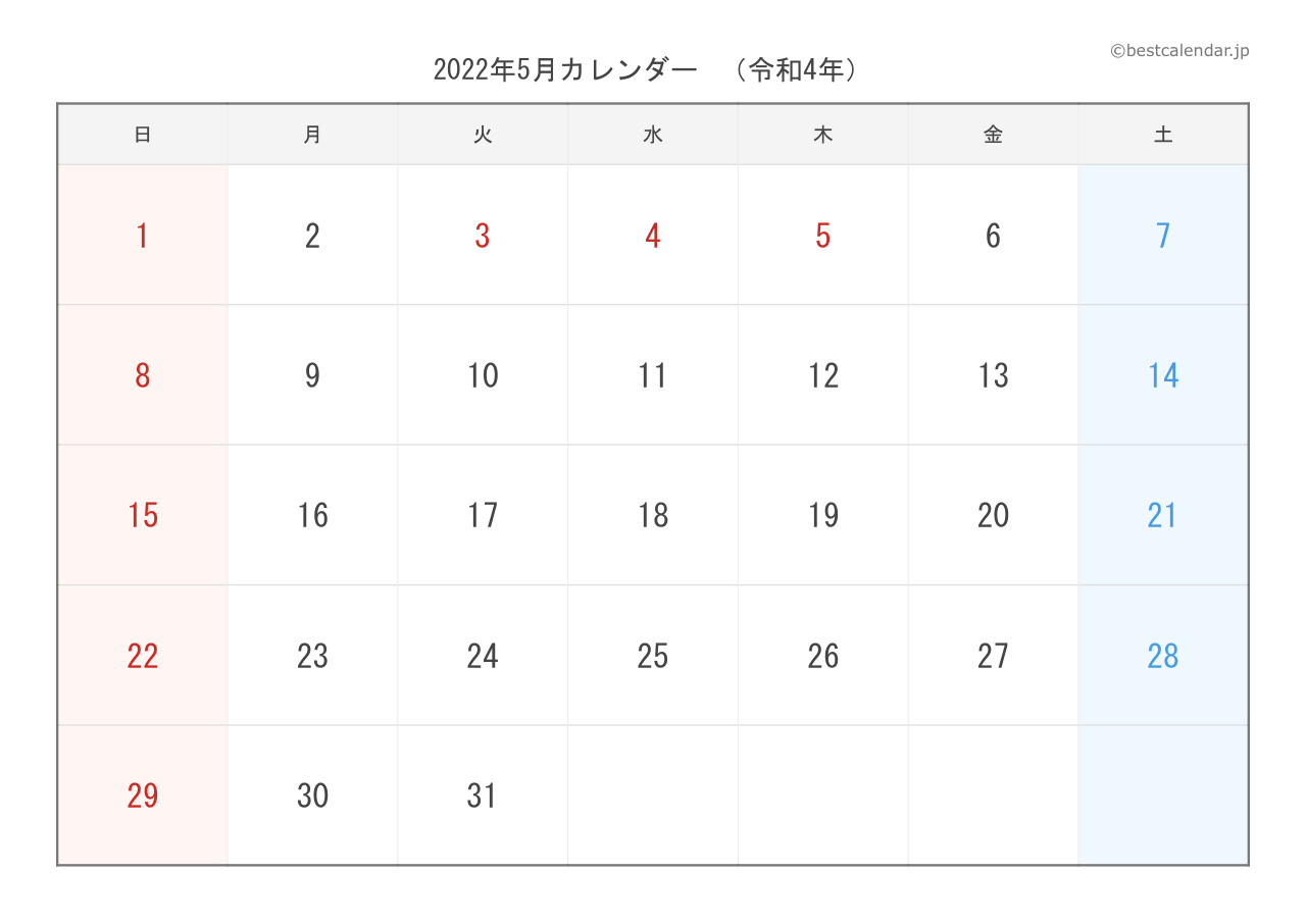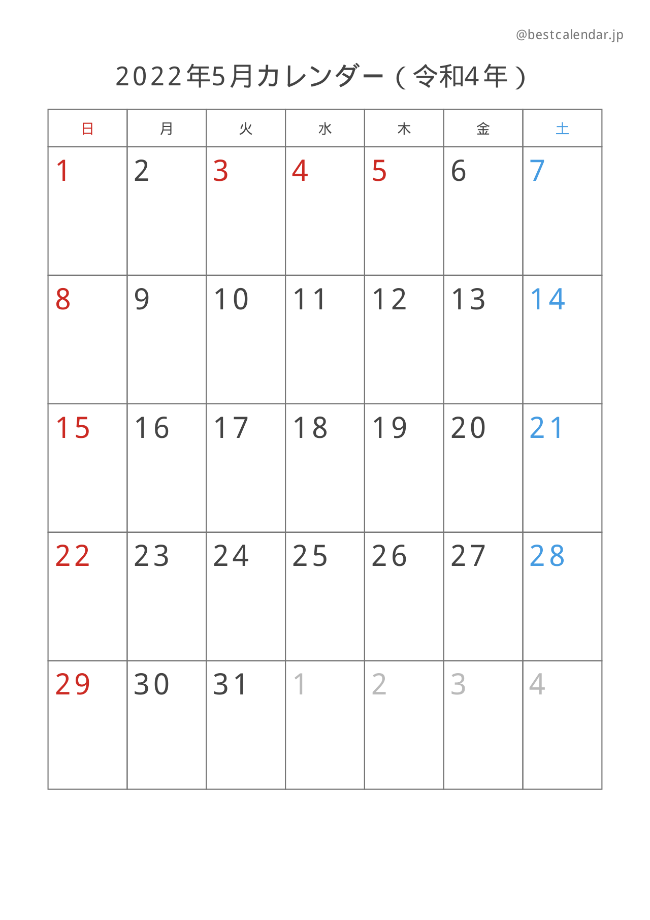 2022年5月のカレンダー(A4縦向き)です。記入重視のレイアウトで設計されています。
