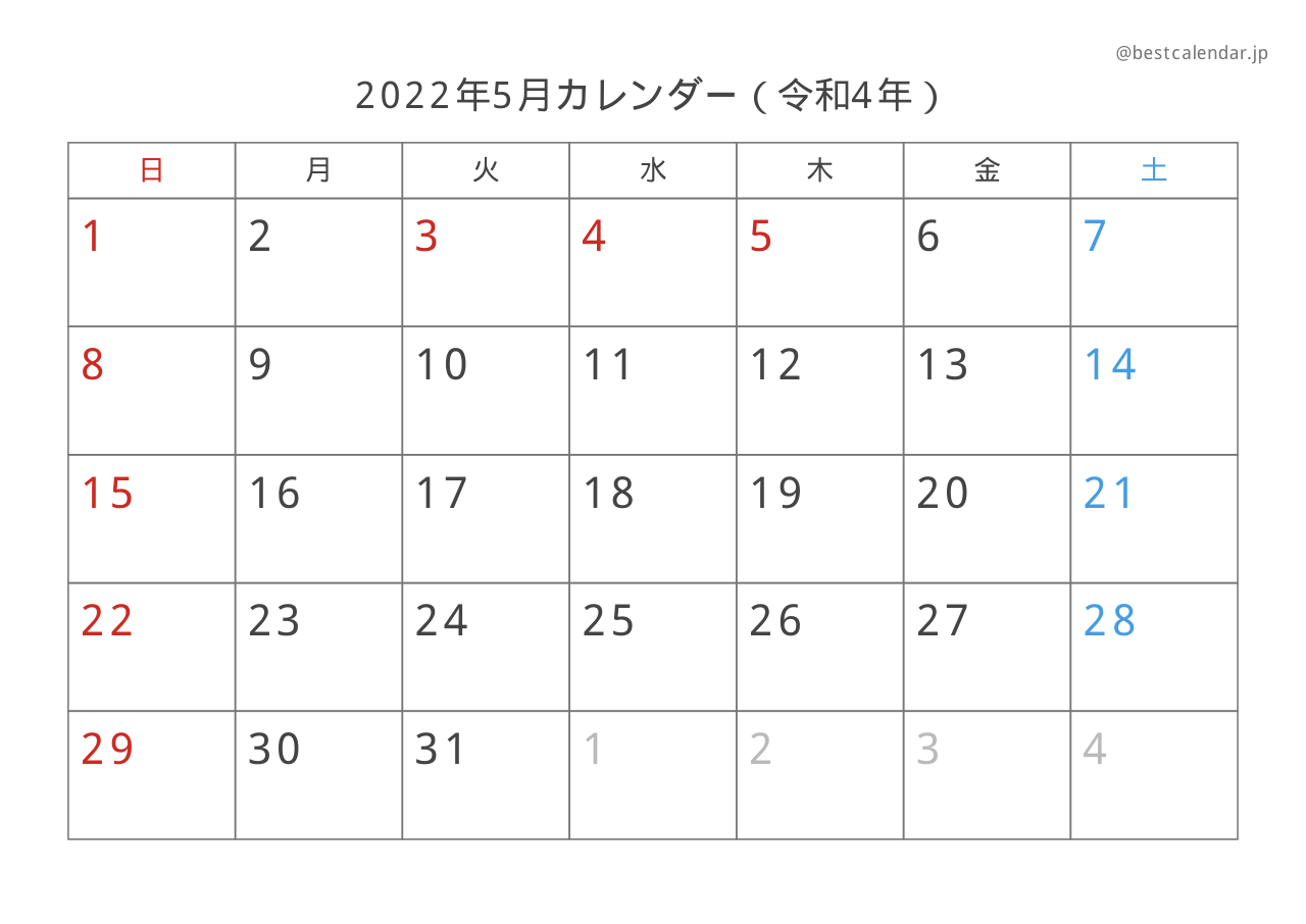2022年5月のカレンダーです。A4サイズ横向きで印刷に最適化されています。