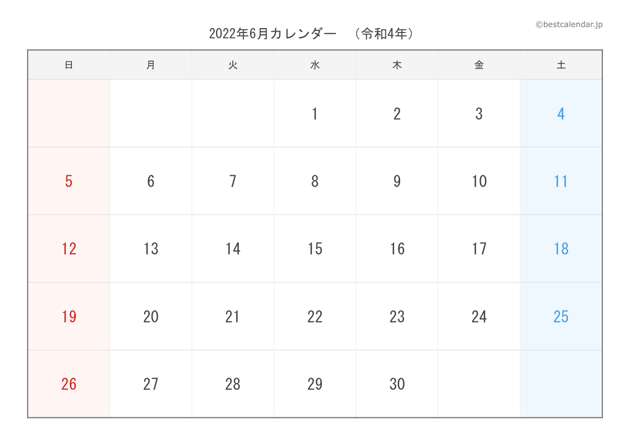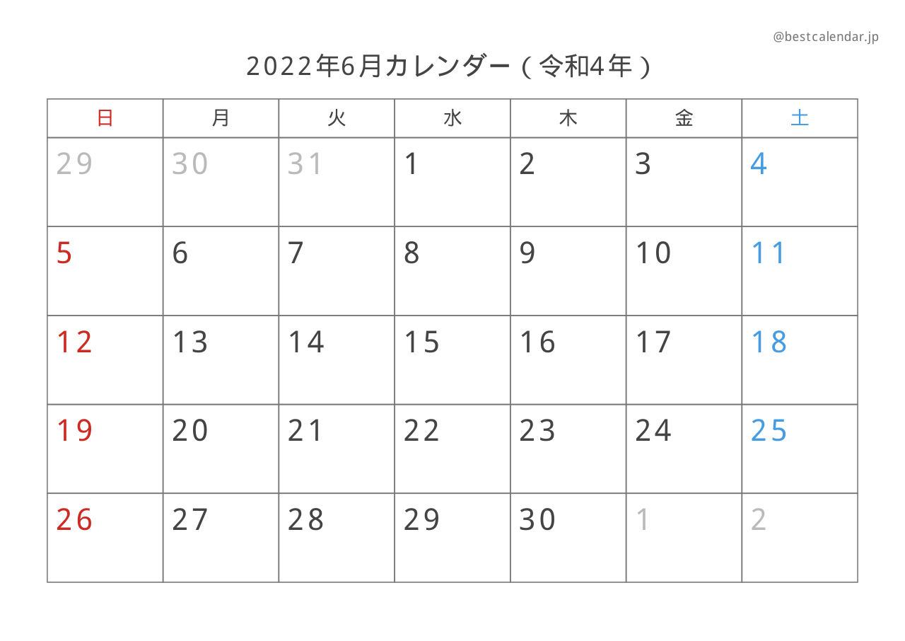 2022年6月のカレンダーです。A4サイズ横向きで印刷に最適化されています。