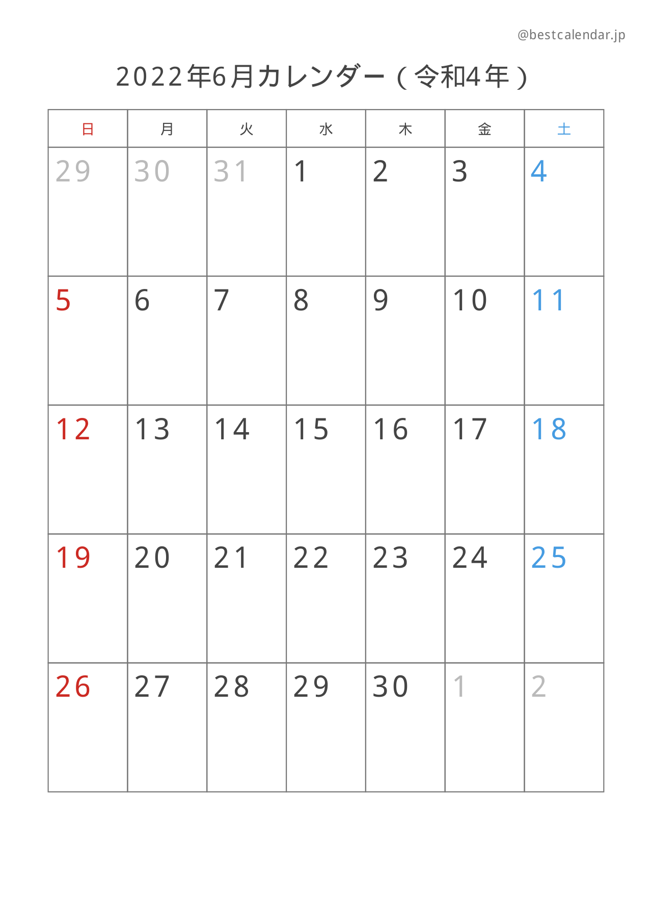 2022年6月のカレンダー(A4縦向き)です。記入重視のレイアウトで設計されています。