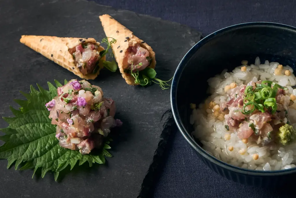 また、名物として提供される鯵フライは、〈あおさを効かせたオリジナルの鯵フライ〉として用意され、揚げたてでの提供が明記されています。さらに、地元ならではの味わいとして〈なめろう〉を複数のアレンジで提供。出汁をかけたお茶漬け風の一皿や、ゴマ風味のコーンに盛り付けた前菜仕立てなど、リゾナーレ熱海ならではの工夫が加えられています。