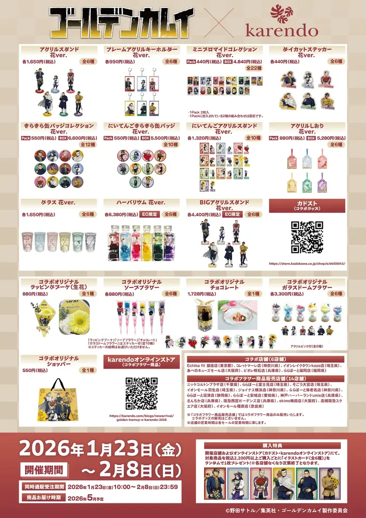 | 販売場所(オンライン) | カドスト(グッズ): https://store.kadokawa.co.jp/shop/e/eki00043/ 、karendo ECショップ(フラワー): https://karendo.com/blogs/newarrival/golden-kamuy-x-karendo-2026 |
