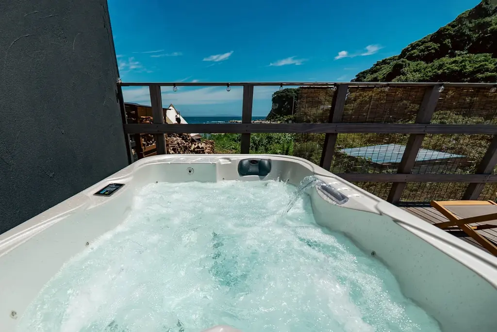 全棟に温水ジャグジーを完備しており、ジャグジーに浸かりながら目の前に広がる太平洋の水平線と空を独り占めする感覚を得られるよう設計されています。季節を問わず、夏は海風を感じながら、冬は湯気と星空を楽しむ滞在が可能です。