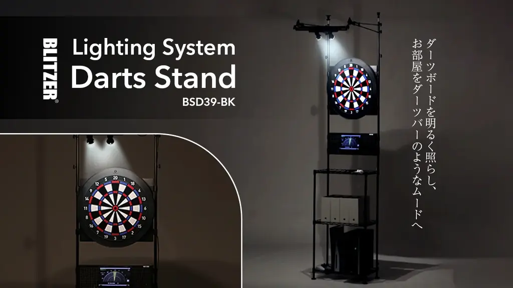 開発の背景には、オンライン対戦や専門アプリの普及によって広がる「家投げ」スタイルがあります。自宅でいつでも練習や対戦ができる環境作りの需要が高まる中、単なる設置台を超えたムード作りと実用性を両立する製品が求められていました。BSD39-BKはその要望に応えるべく、照明による視認性向上と雰囲気演出、大容量の収納、配線整理機能を一体化しています。