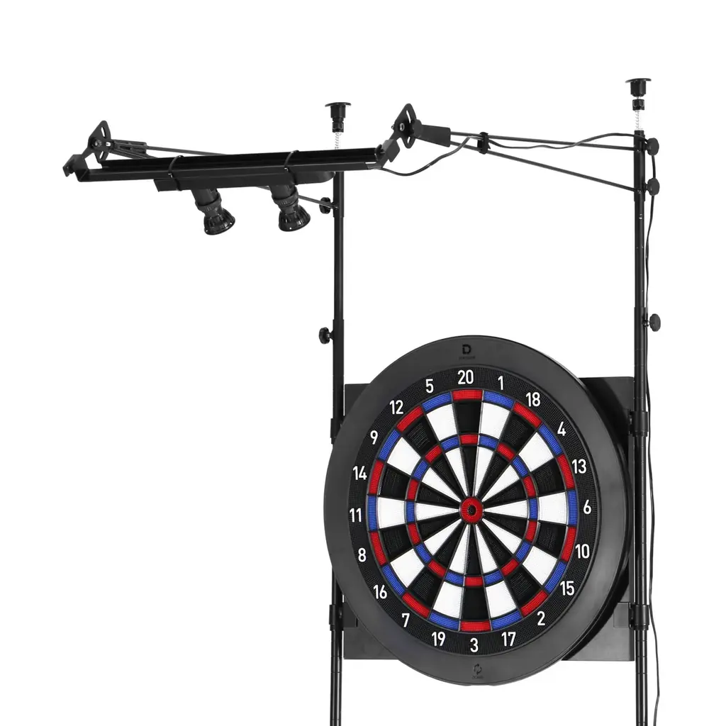 照明の高さ・角度は調整可能で、角度は最大90度まで対応しています。これにより、セグメントに影が落ちることを抑え、夜間の練習時でもターゲットを明瞭に狙える視認性を確保します。視認性向上は投射精度に直結するため、練習効率の向上にも寄与します。同時に間接照明として部屋全体のムードを変えるため、ダーツバーのような落ち着いた臨場感を自室に再現することが可能です。