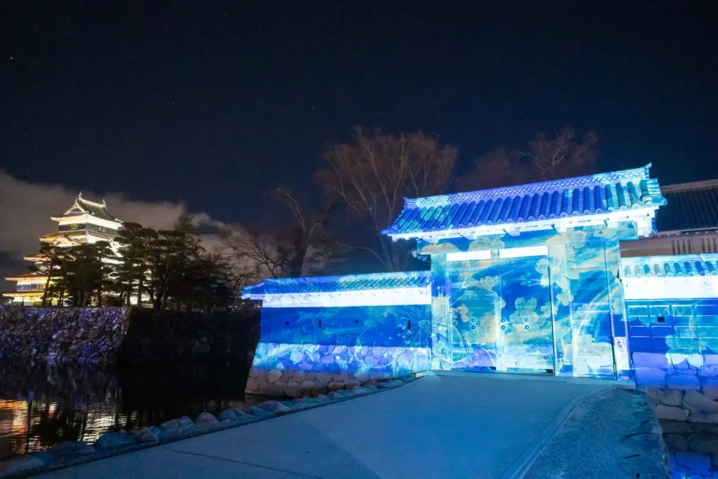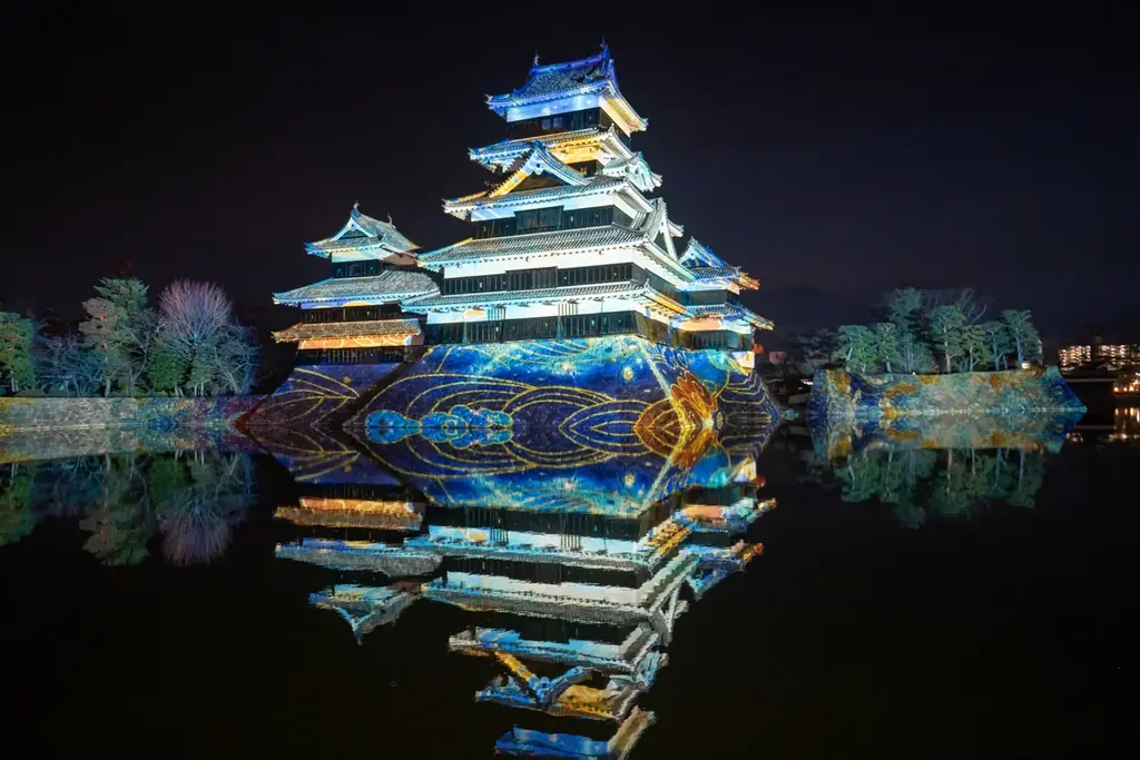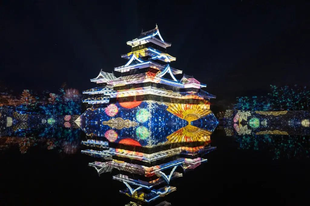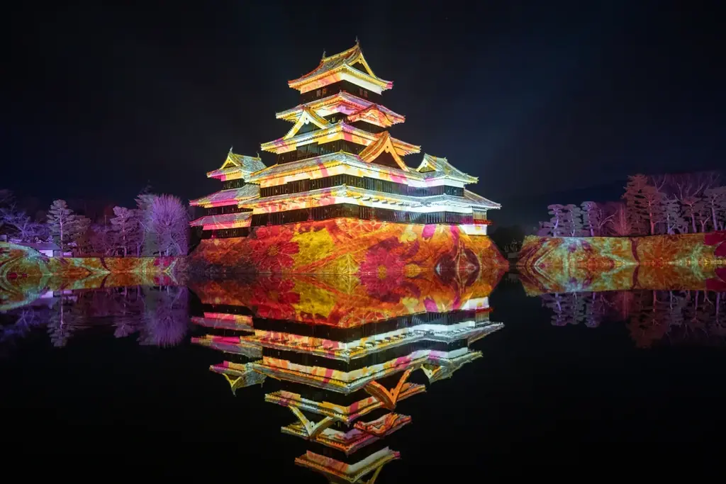 開催は2025年12月13日〜2026年2月15日、会場は松本城公園。上演は毎夜18:00〜22:00で、約9分の映像を3分の転換を挟んで繰り返し投影。会期ごとに演出が変わる。