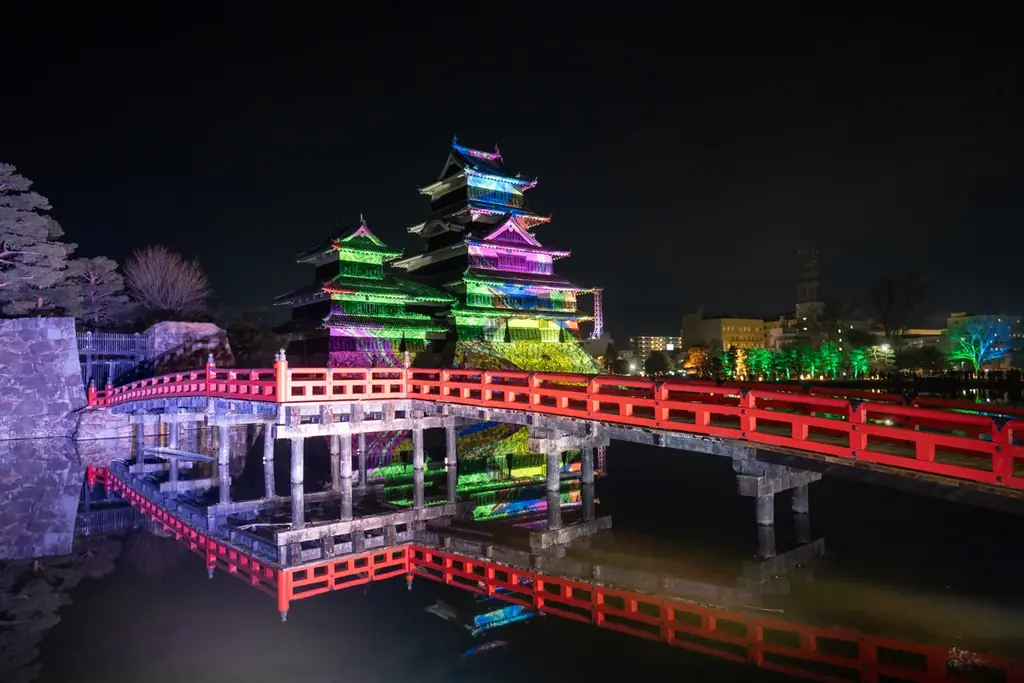 本プロジェクションマッピングは、松本城天守(五重六階、現存国宝5天守の一つ)および石垣への投影を中心に、園路でのインタラクティブコンテンツ、城門でのプロジェクション、松本城公園全体のライトアップを組み合わせた総合的な光のイベントです。観覧は無料で、事前申し込みは不要です。