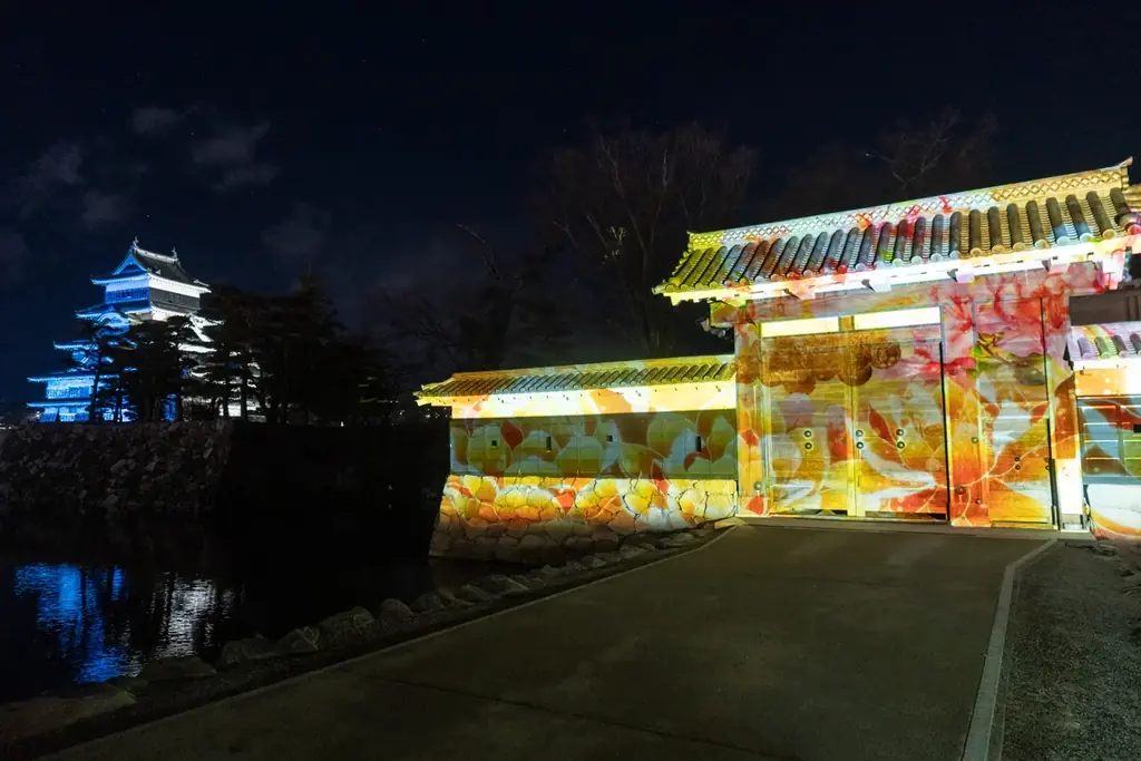 演出内容 松本市立博物館所蔵の錦絵・屏風絵等の映像、松本てまりや提灯、桜や北アルプスの花々を用いた天守・石垣へのプロジェクション、園路インタラクティブ、城門プロジェクション、ライトアップ等