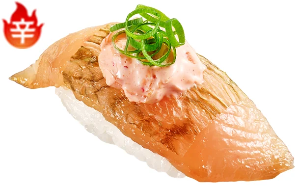 ボイルした本ずわい蟹の上に、かにみそと柚子胡椒を混ぜたトッピングを載せた創作すしです。柚子胡椒の香りとピリッとした辛み、かにみその濃厚なコクが蟹の旨みを引き立てる組合せになっています。リリースでは、かにみそに関しては複数種類の蟹を併用する場合がある旨が明記されています。