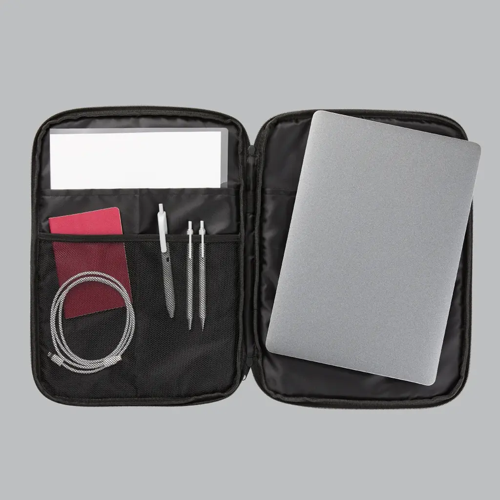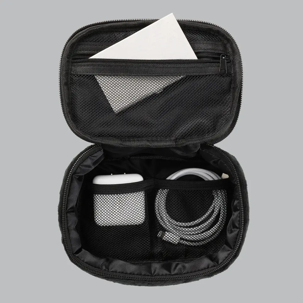 主な機能としては、チャック付きのメッシュ仕切り、充電ケーブル等を通せるケーブルポート、モバイルバッテリーを入れたままスマートフォン充電が可能な点などが挙げられます。文房具、ガジェット、旅行用の化粧品など多目的に利用できます。