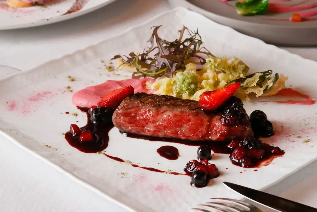 パスタは桜エビと桜マスを用いた桜色のタリオリーニで、海の幸と春の色合いを同時に楽しめる一皿です。魚料理は蝦夷鮑をパイ包み焼きにし、桜色のソースで仕上げられ、肉料理は佐賀牛のサーロインをグリエしベリーソースで軽やかな酸味を添えています。