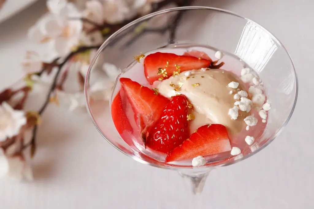 「シーズナルコース~SAKURA~」は、乾杯のカクテルからデザートまで桜をテーマに構成されています。スタートは桜の香りが特徴の乾杯カクテル「Sakura Royale」で、春の幕開けを印象付けます。