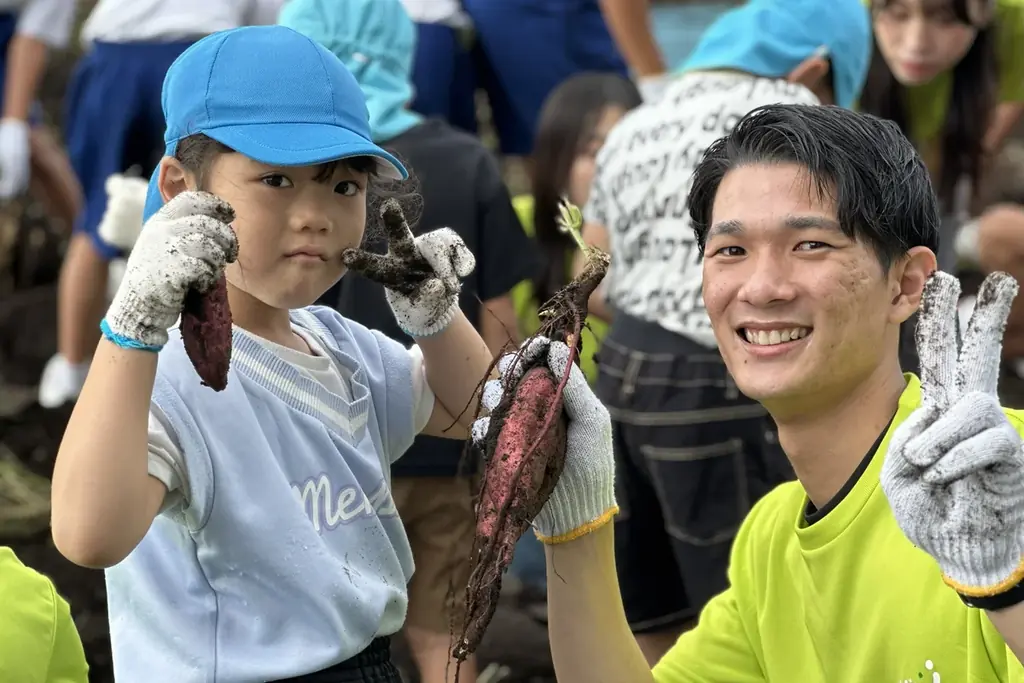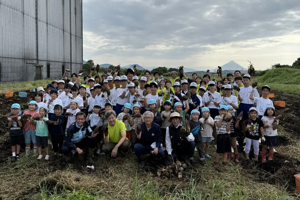 その後、2025年10月には収穫作業を行い、4月に植えた苗5,000本から約5,000kgのサツマイモを収穫しました。収穫には園児や枕崎市立立神中学校の生徒も協力しており、地域との連携を重視した実践的な取り組みになっています。