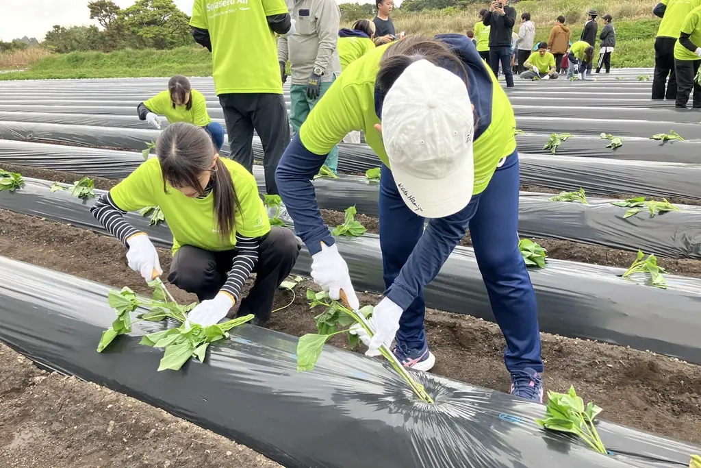 苗の植え付けは2025年4月に実施され、地元の妙見保育園の園児およびソラシドエアから参加した新入社員50名が作業に参加しました。新入社員にとっては研修の一環として地域の現場を学ぶ機会にもなっています。
