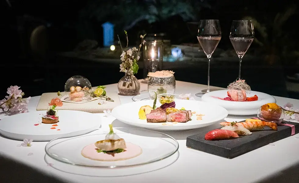 オリエンタルヒルズ沖縄(沖縄県恩納村)は、2026年2月23日(月)から3月1日(日)までの1週間限定で、フレンチ・鉄板焼き・江戸前鮨の3ジャンルを1つのフルコースとして提供する特別宿泊プランを実施します。本プランの特別コースは「FLEUR DE CERISIER(フルール・ドゥ・スリジエ、桜の花)」と名付けられ、桜をテーマに春の沖縄の旬を織り交ぜた構成です。