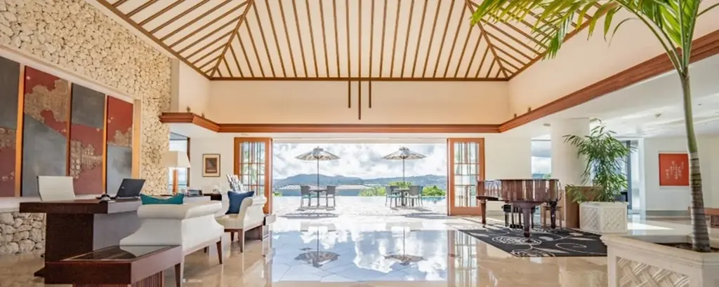 オリエンタルヒルズ沖縄は全14棟、全室がオーシャンビューでプール付きのスイートヴィラ&オーベルジュです。代表的な客室には「エグゼクティブスイート」(162㎡、テラスとプール含む)があり、海抜約30mの高台に位置するため東シナ海を一望できる立地です。