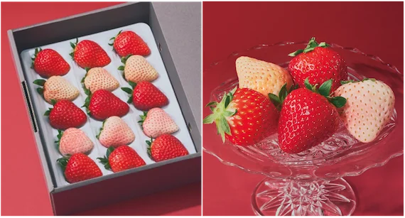 - ストロベリーアソートボックス KŌHAKU — 「今季、もっとも美しい 15 粒」。価格:¥15,800(税込・送料無料)。構成:紅白いちご 5品種、全15粒。品種名:あまりん / コットンベリー / 古都華 / 淡雪 / とちおとめ。