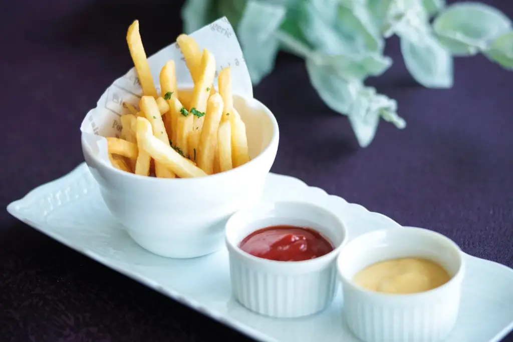 • フライドポテト(オプションメニュー) ¥500:トマトケチャップとトリュフ風味のマヨネーズ添え
