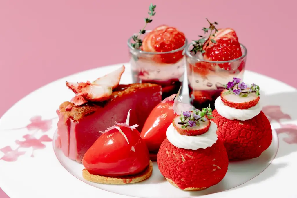 提供されるメニューは「いちご尽くし」を意識した構成で、スイーツとセイボリー双方にいちごが用いられています。見た目に配慮したフォトジェニックなデザートが並びます。