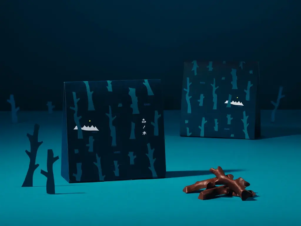 | 森ノ木 黒 | 1箱8本入 | 1,242円 | 薄く焼いたクレープ生地を砕いたフィアンティーヌとローストアーモンドを混ぜ込んだクランチチョコレート。版画家・大谷一良氏の木々モチーフをかたどった3つの形が特徴。 |
