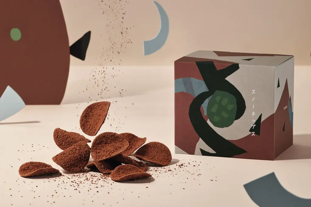 スノーチップスはトリプルチョコレートの濃厚さと粉雪のような口どけを特徴にしたチョコレートチップスです。1箱4袋入で価格は1,485円(税込)。生地に練り込んだチョコレート、噴霧したチョコレート、粒状に纏わせるチョコレートの三層構造で、極限まで薄くした生地を独自の揚げ焼き製法で仕上げています。