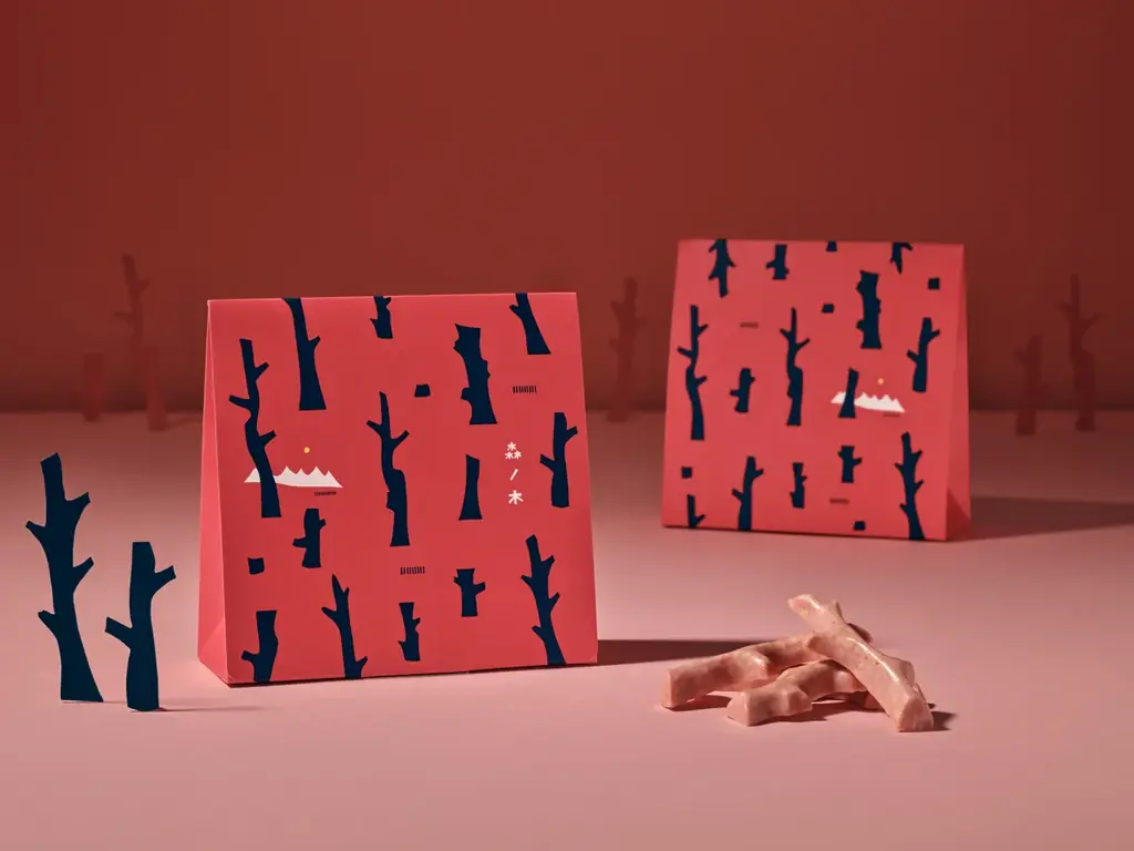 パッケージデザインにもこだわりがあり、雪や山を想起させるモチーフとして版画家・大谷一良さんの作品を使用しています。ブランド誕生以来、作品の世界観をパッケージやショップ空間に反映させ、北海道の冬の情景を表現しています。