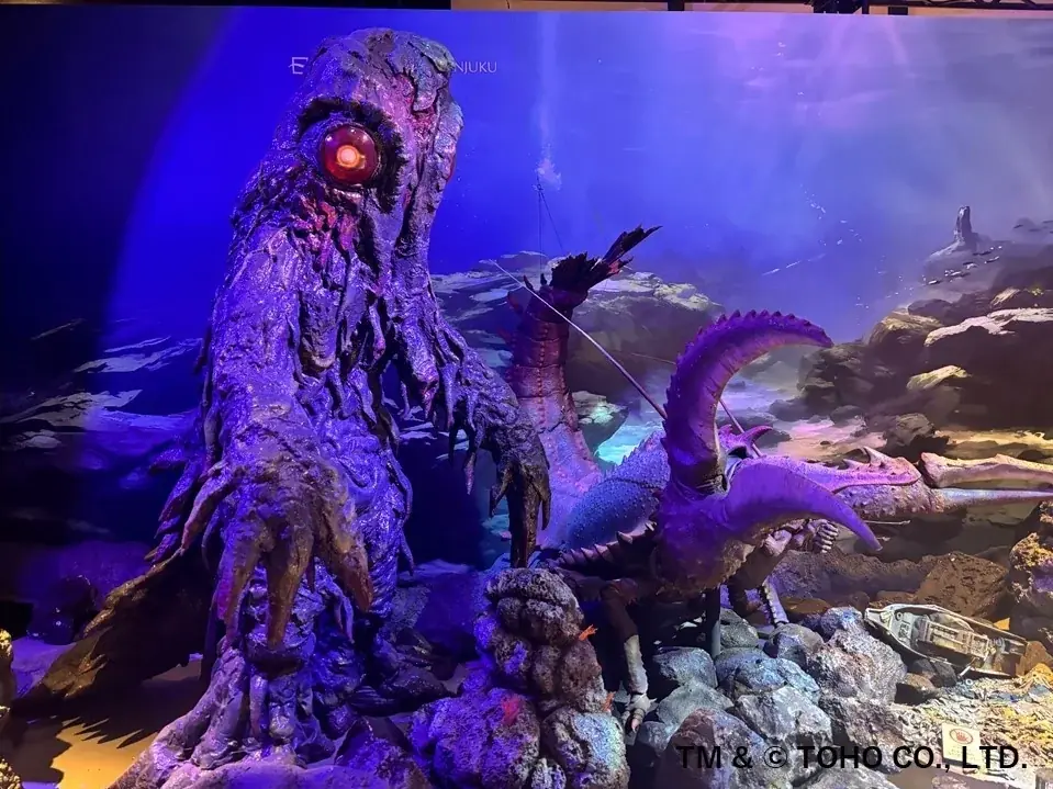 展示は2023年より継続的に行われてきたシリーズの第8期にあたり、今回も東宝の監修を受けて制作されています。青々としたライティングにより水面や海中を思わせる演出が施され、鋭い眼光を放つゴジラと、迫力ある造形のへドラ、エビラを間近で観覧できます。ホテルに到着するとすぐに視覚的な存在感を感じられる演出となっています。