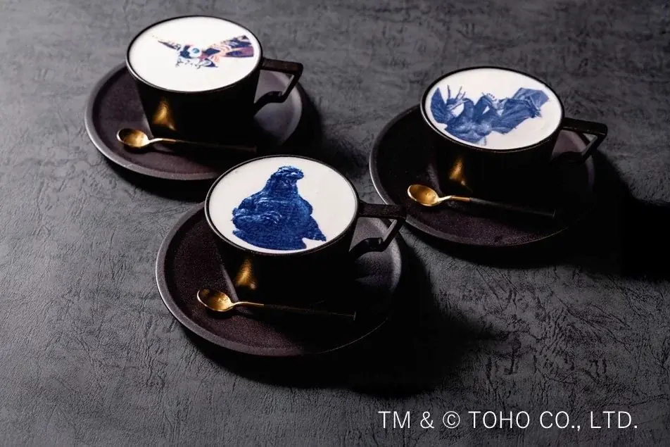 | 代表的なメニュー例と価格 | ゴジラプリントアートラテ 各¥1,870/ゴジラプリントアートソーダ 各¥1,870/ゴジラvsモスラ パンケーキ ドリンクセット ¥3,850/アート和パフェ(キングギドラ)¥2,420 |