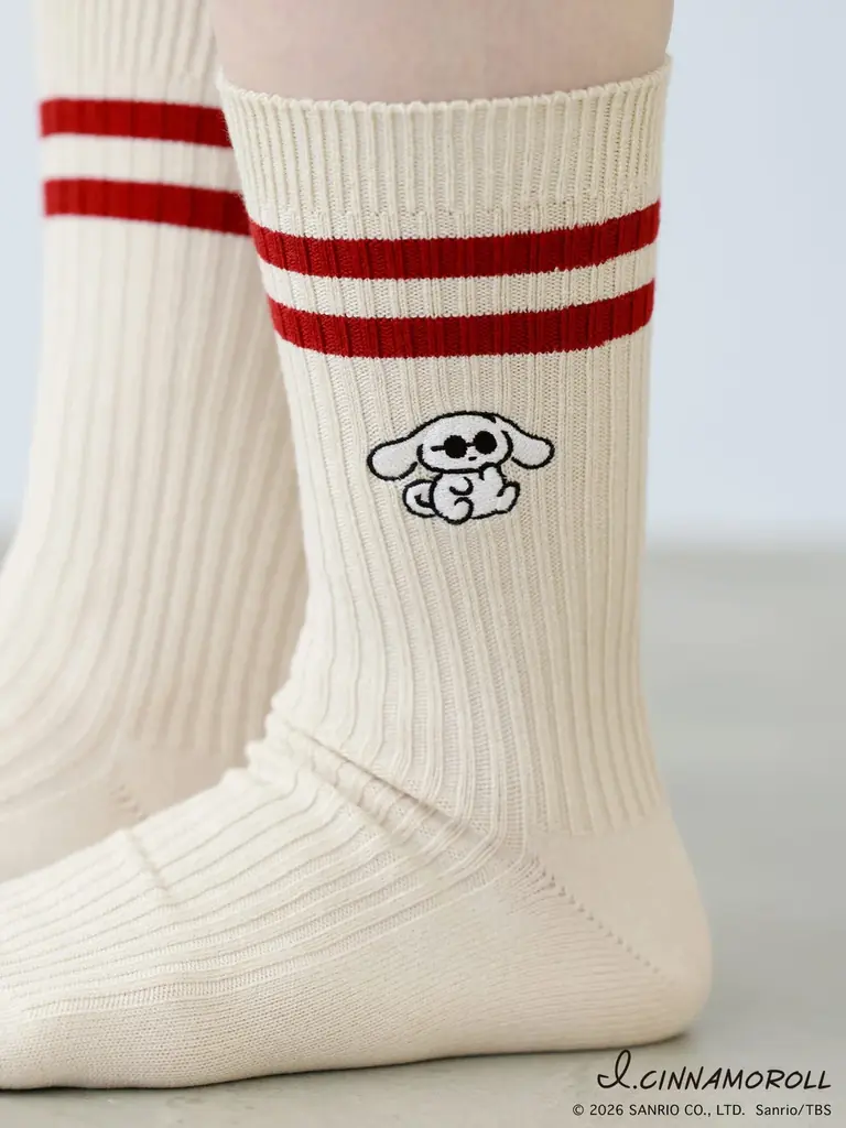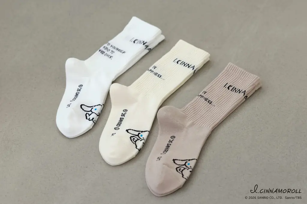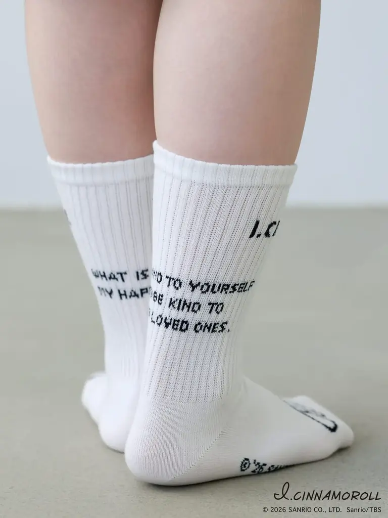 カジュアルに履けるアメリブソックスをベースに、アイシナモロールのロゴとメッセージを散りばめたデザイン。左右で異なるポーズのシナモンが配され、”ご自愛”メッセージがさりげないポイントになっています。