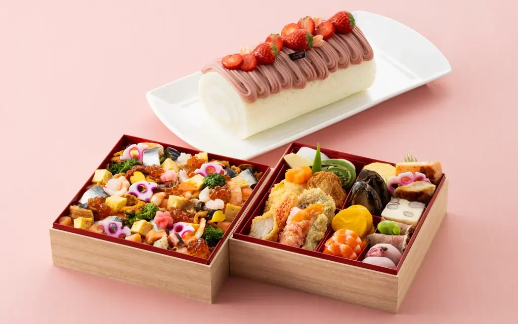 東館1階のザ・ベーカリー&ペイストリーでは、家庭での祝宴を華やかにする和食・寿司・スイーツのテイクアウト商品を中心に用意しています。職人が仕上げる二段重やちらし寿司、ルビーチョコレートを使ったロールケーキなど、見た目と味わいの両面で春らしさを演出します。