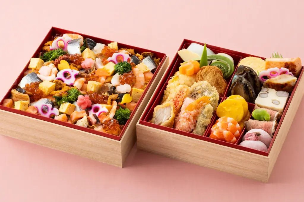 - ひなまつり二段重:¥12,000(税込)/2〜3名様用。和食八寸とちらし寿司を二段に詰めた特別重で、職人の繊細な技が光る内容になっています。