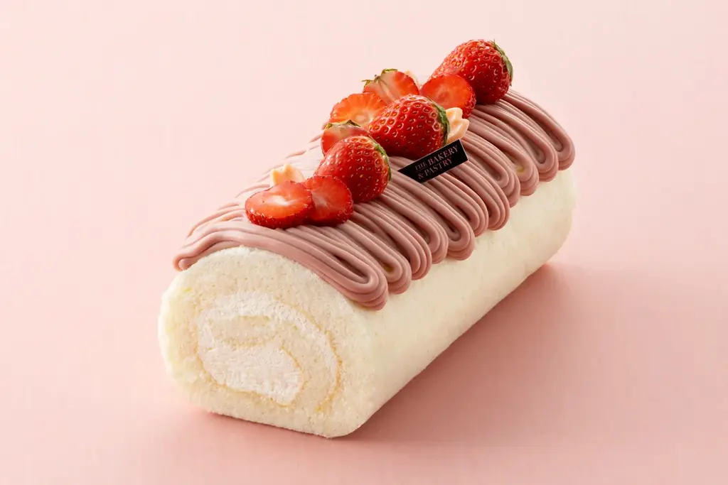 - ひなまつりロールケーキ:¥2,800(税込)。白い生地に生クリームを包み、ルビーチョコレートのクリームと花びら、苺で飾った季節感あるスイーツです。
