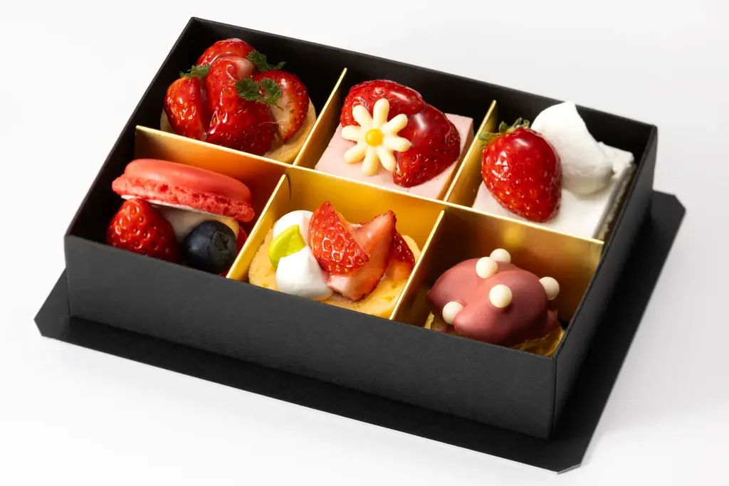 - ひなまつりスイーツボックス:¥3,000(税込)。6種類のスイーツを詰め合わせたボックスで、見た目にも華やかな苺を主役にした詰め合わせです。