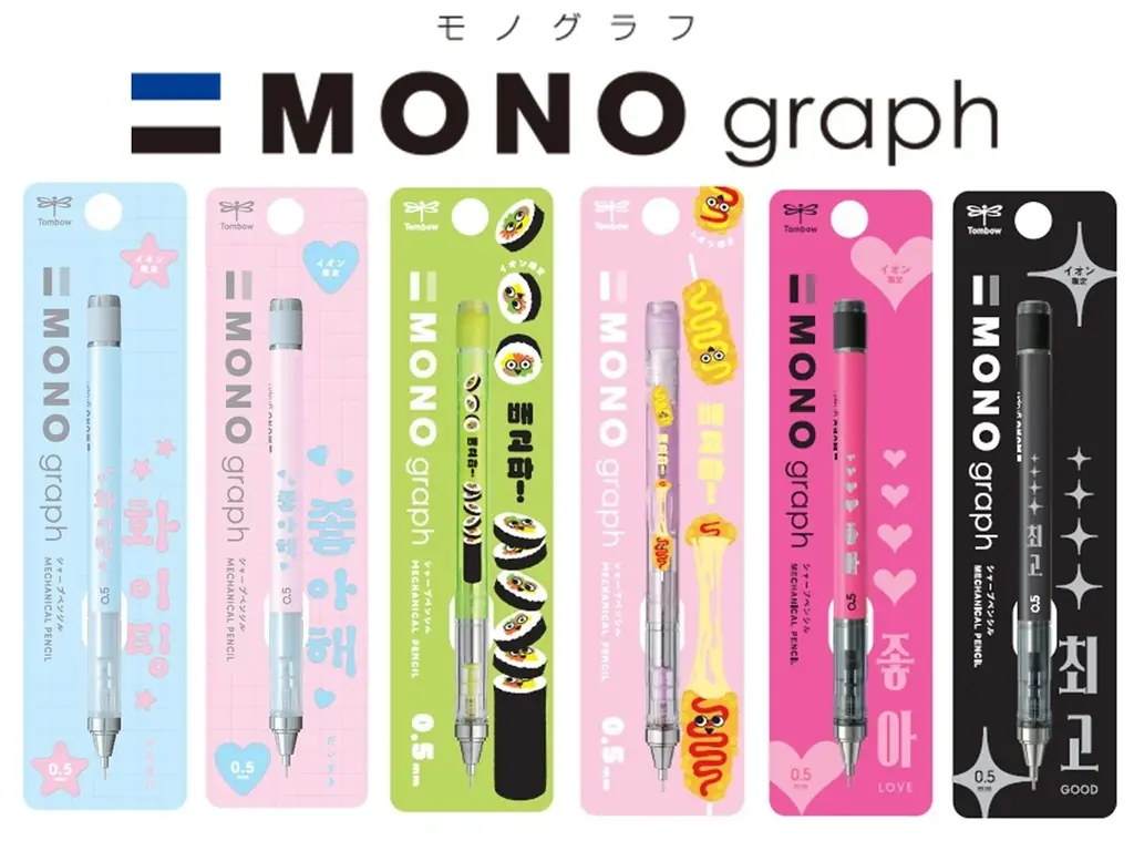 トンボ鉛筆 モノグラフシャープ(イオン限定)は、韓国グルメやハングルをモチーフにしたデザインを採用。振るだけで芯が出る機構とMONO消しゴム搭載が特長です。価格は本体598円(税込657.80円※3)。カラーはロマンティックブルー、ロマンティックピンク、キンパくん、ハットグちゃん、キラブラック、ハートピンク。