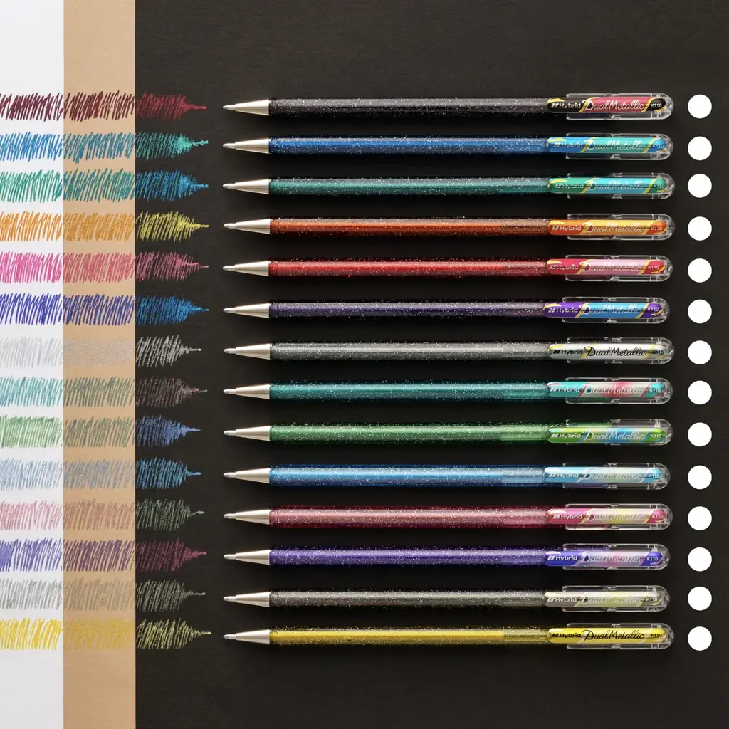 ぺんてる デュアルメタリックは1本で2つの輝きを持つボールペンで、白紙では繊細なきらめき、黒紙では深みのある輝きを演出します。単品1本 本体228円(税込250.80円※3)、7本セット 本体1,480円(税込1,628円)、14本セット 本体2,780円(税込3,058円)。カラーは14色。