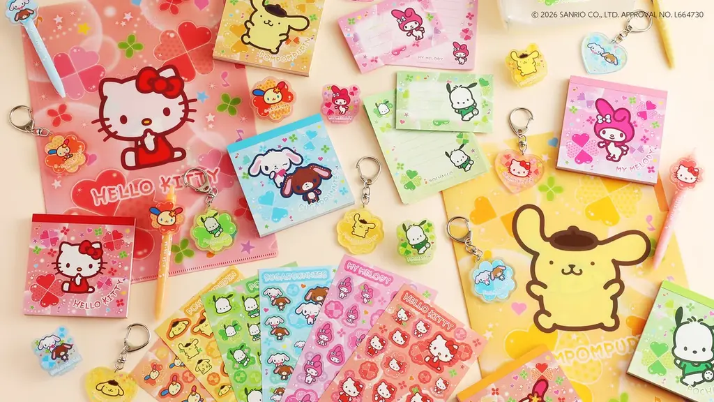 イオン限定「サンリオキャラクターズ」ステーショナリー・雑貨は、平成ポップとラッキーモチーフという2つのテーマで展開。メモ帳やシール、キーホルダー、ダイカットパスケースなどを含む全68品目で、価格帯は本体348円(税込382.80円※3)~本体1,980円(税込2,178円※3)です。