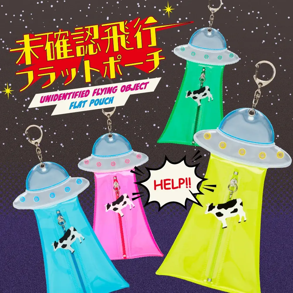 サンスター文具の未確認飛行フラットポーチは、アクスタやミニフィギュアを入れて楽しめるデザインで、本体980円(税込1,078円)、カラーはイエロー、ブルー、グリーン、ピンク。