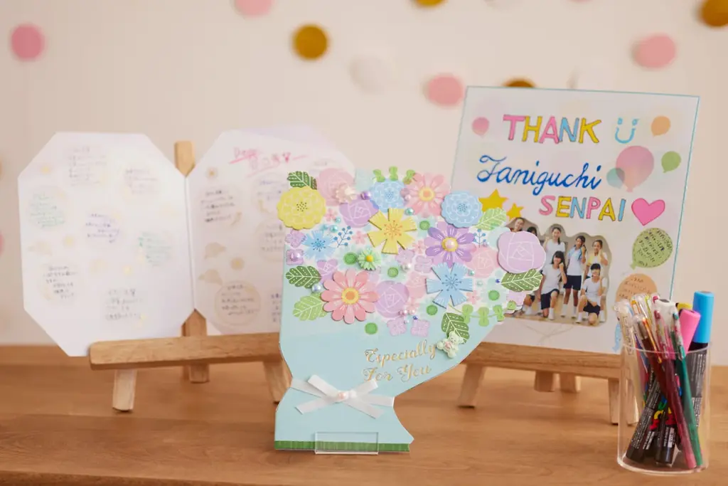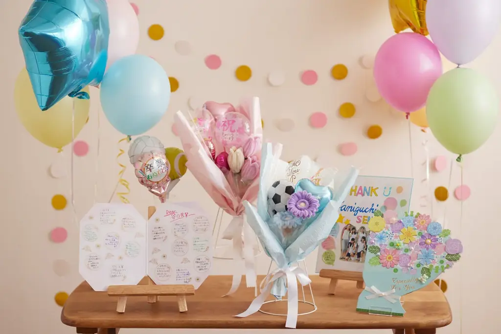 思い出づくりを演出するバルーンはスティックタイプやインパクトのあるフィルムタイプを用意。価格は本体198円(税込217.80円)~本体798円(税込877.80円)、最大22種類。色紙は花束型やメダル型など多様な形を用意し、価格は本体248円(税込272.80円)~本体2,480円(税込2,728円)、最大26種類です。