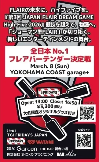 TGI FRIDAYS JAPANが主催し、ワタミ株式会社の協力により開催される『第3回 JAPAN FLAIR DREAM GAME High‑Five 2026』(以下、High‑Five 2026)は、2026年3月8日(日)にYOKOHAMA COAST garage+(横浜コーストガレージプラス)で行われます。本大会は、全国のフレアバーテンダーによる技術競技に留まらず、「競技を超えて、物語へ。」というテーマのもと、表現力と演出性を重視したショーマン型フレアを評価する場へと進化しています。