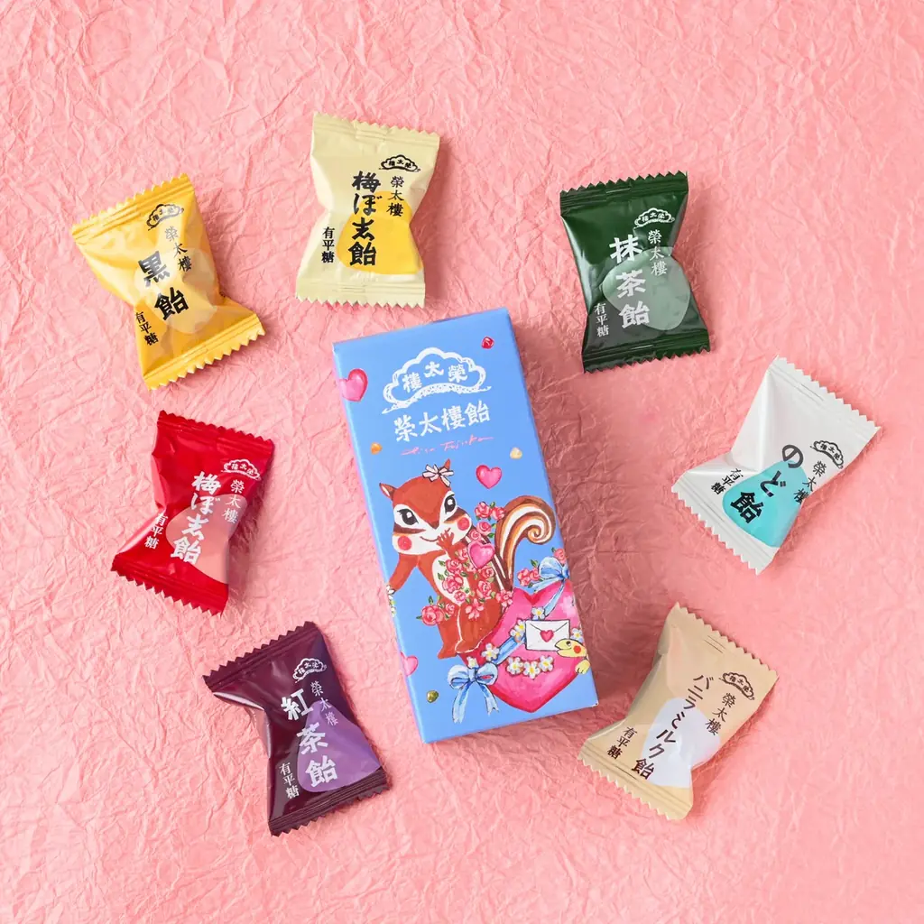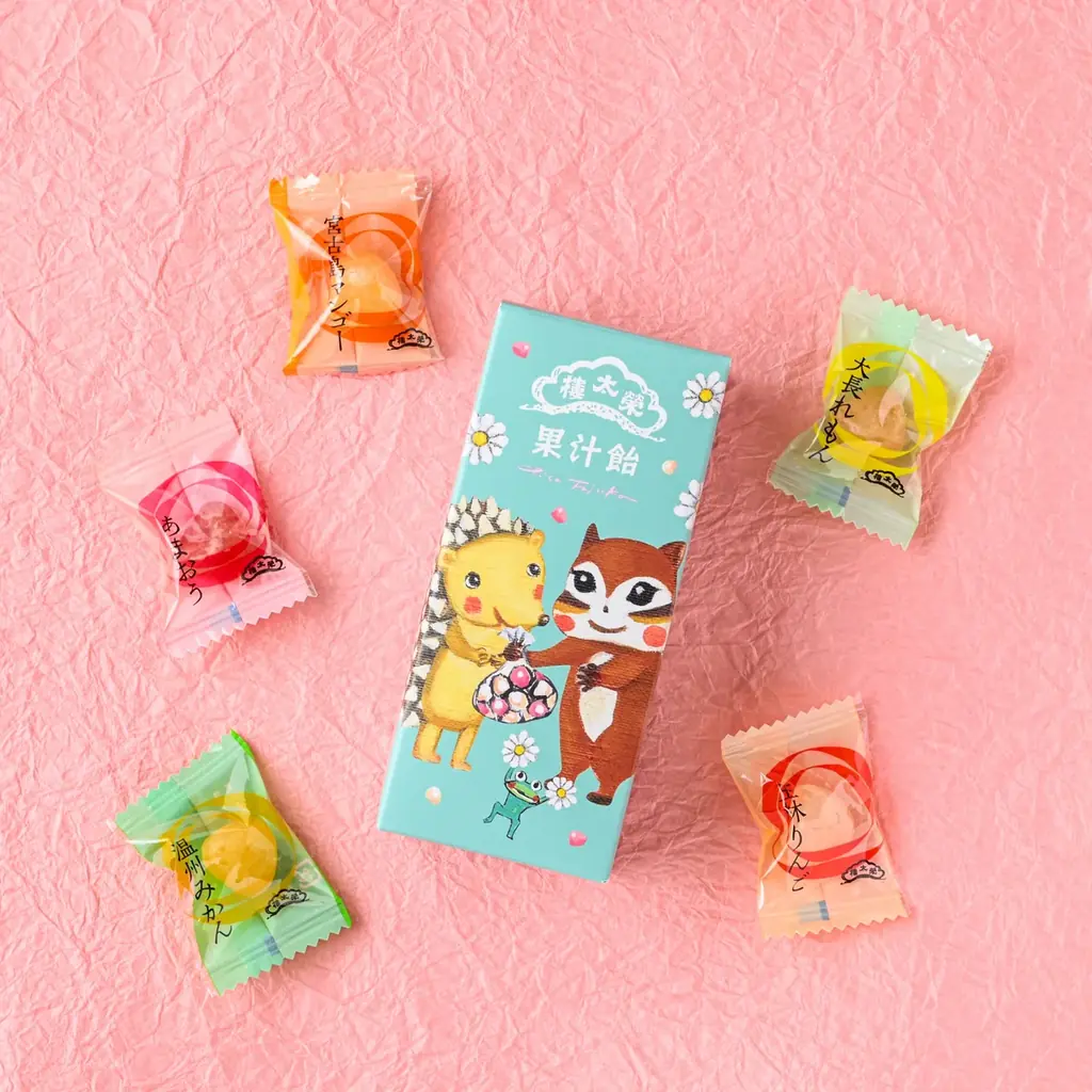 藤岡ちさ氏のリスや小動物イラストをあしらった限定パッケージが特徴。商品は伝統の榮太樓飴と国産果汁使用の無香料・無着色の果汁飴の2種で、贈り物向けの仕様です。