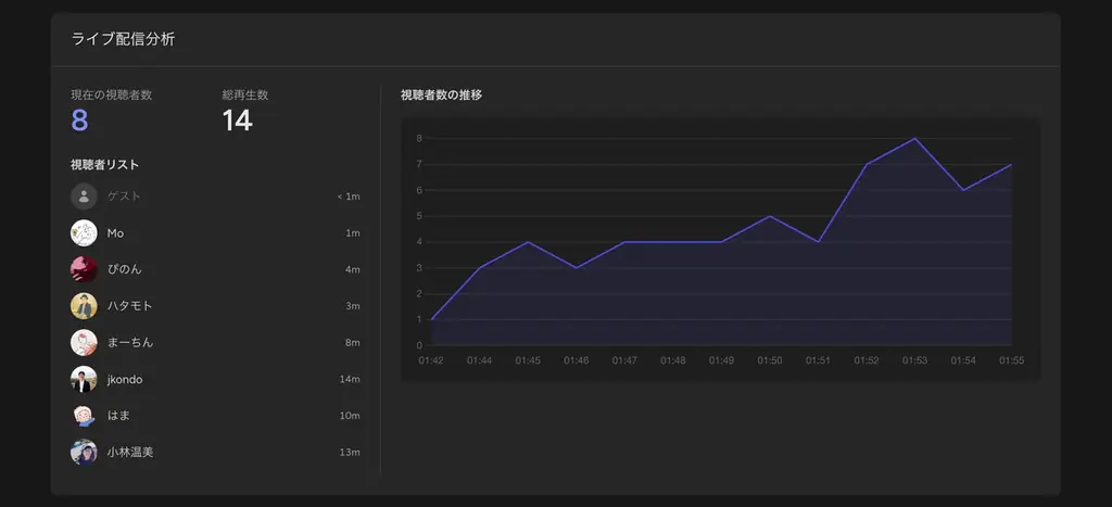 チャット機能や視聴数の推移確認により番組の盛り上がりを可視化できます。