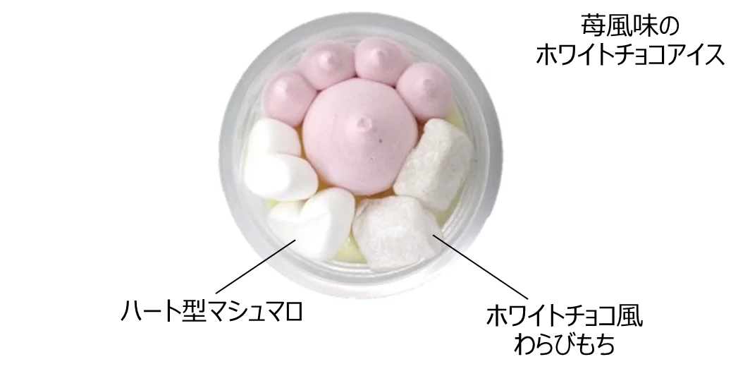 数量限定で展開されるアイスで、猫の日にちなみ肉球をモチーフにした見た目が特徴です。ピンクの肉球部分は苺風味のホワイトチョコアイス、白い部分にはハート型マシュマロとホワイトチョコ風わらびもちが入っています。数量限定のため、在庫がなくなり次第終了します。