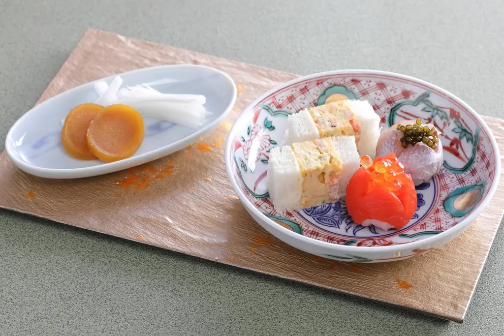 • セイボリー:桜海老の出汁巻きサンド、小鯛昆布〆手毬寿司 キャビア添え、燻製サーモン手毬寿司 いくら添え、からすみ