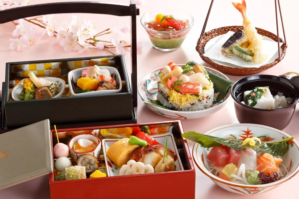 花見膳は造り三種盛りと手提げ弁当、天ぷら、吸物、ちらし寿司、水菓子で構成されています。手提げ弁当の上箱と下箱には季節の食材を用いた惣菜が丁寧に詰められています。