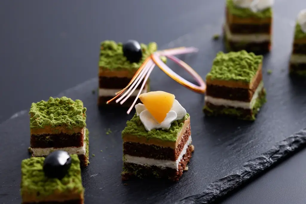- 土佐茶パウダーで仕上げた抹茶ケーキ:土佐茶特有の上品な旨みとほろ苦さを生かした一口キューブの抹茶ケーキ。しっとりとした口当たりで和の趣が感じられます。
