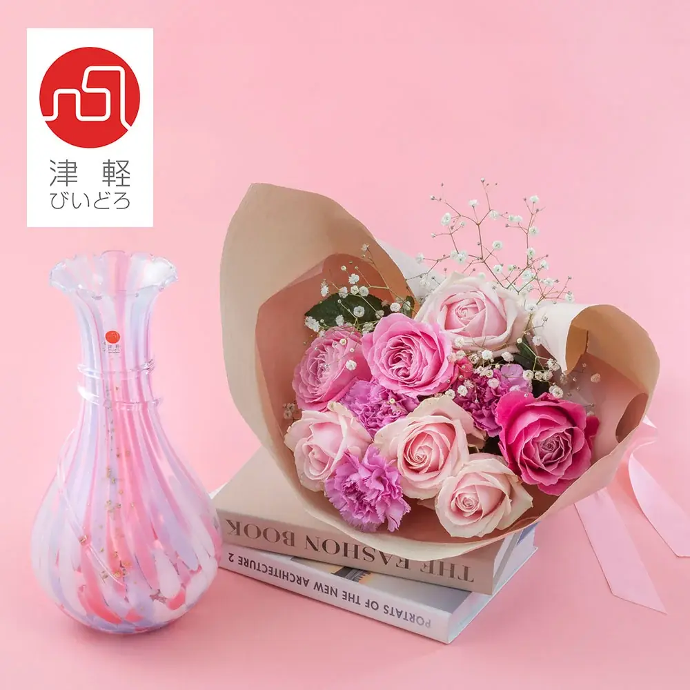 商品名 津軽びいどろ「口すぼまり 花瓶」と花束のセット 価格 22,000円(税込・送料別) 花材 生花(バラ、カーネーション、カスミソウ) サイズ 花束:高さ約46cm、幅約24cm、奥行約23cm/花瓶:高さ約28.5cm、最大幅約15cm 特徴 津軽びいどろの手作り花器と国産花材のセット。工芸品としても楽しめる花器は光を通して室内装飾としても利用可能。 -
