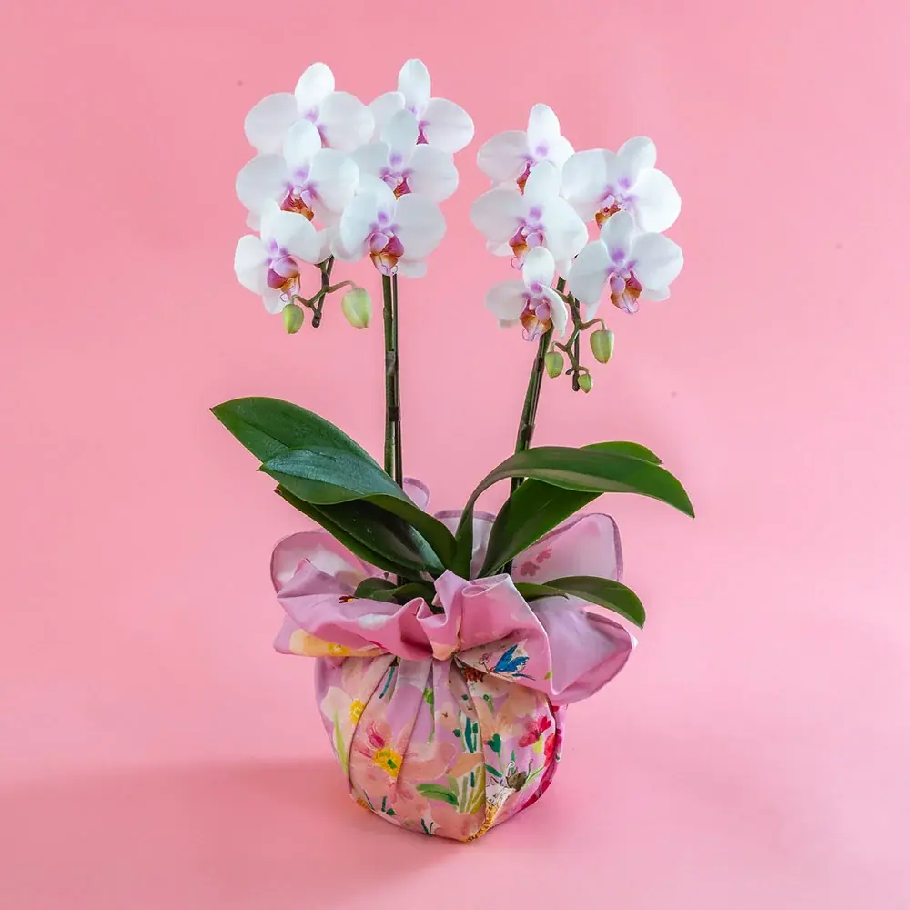 商品名 NozomiYuasa×ミディ胡蝶蘭 風呂敷ラッピング 価格 8,800円(税込・送料別) 花鉢 ミディ胡蝶蘭(ピンクリップ)2本立ち/布製ラッピング サイズ 高さ約35cm、幅約25cm、奥行約20cm 特徴 湯浅望デザインのオリジナル風呂敷で包んだミディ胡蝶蘭。風呂敷は京都の老舗「むす美」と共同制作。 -