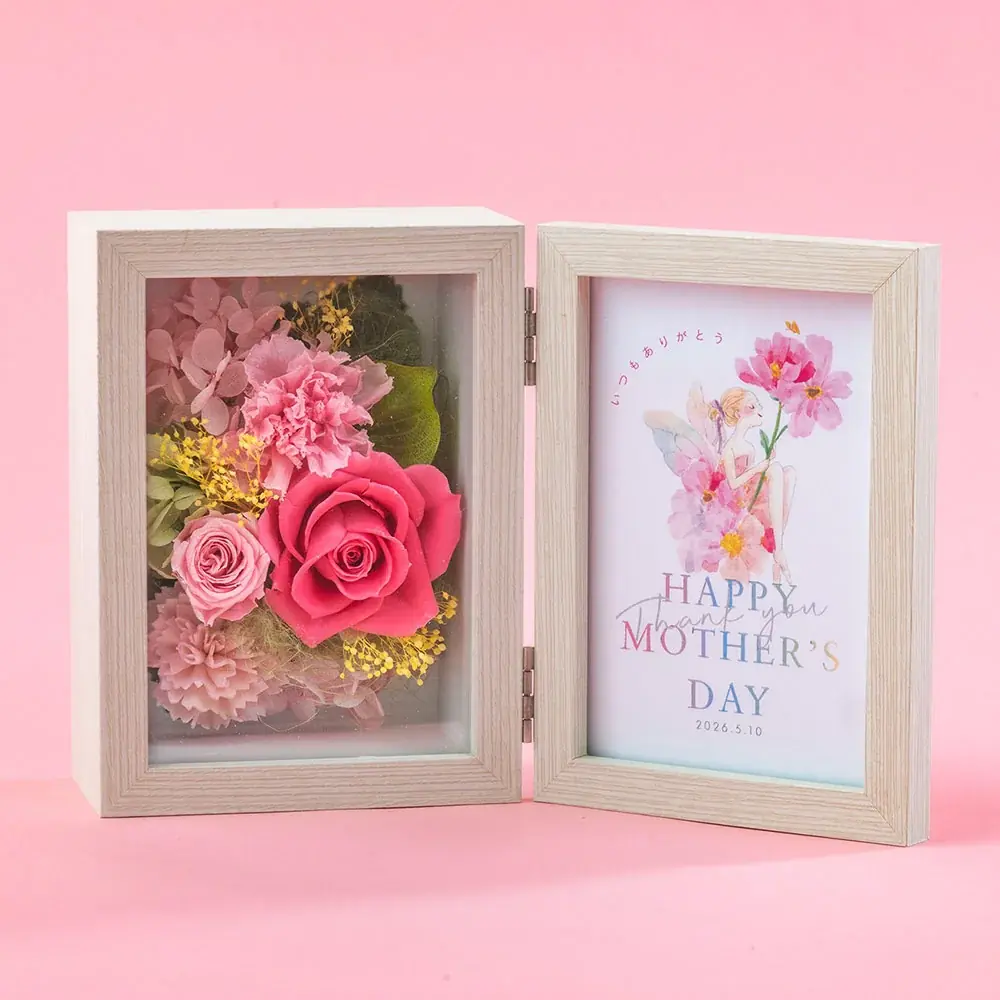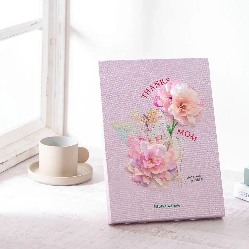 商品名 NozomiYuasa×フラワーフォトフレーム「フェアリー・ブルーム」 価格 11,000円(税込・送料別) 花材 プリザーブドフラワー(バラ、カーネーション、アジサイ、カスミソウ、グリーン)、樹皮製造花、アーティフィシャルフラワー(グリーン)/木製フレーム(ガラス付き) サイズ 高さ約15cm、幅約11cm、奥行約7cm(閉じた状態)/Lサイズ縦写真対応 特徴 湯浅望のイラストを添えた限定アイテム。お気に入りの写真を入れて飾れるフレーム。