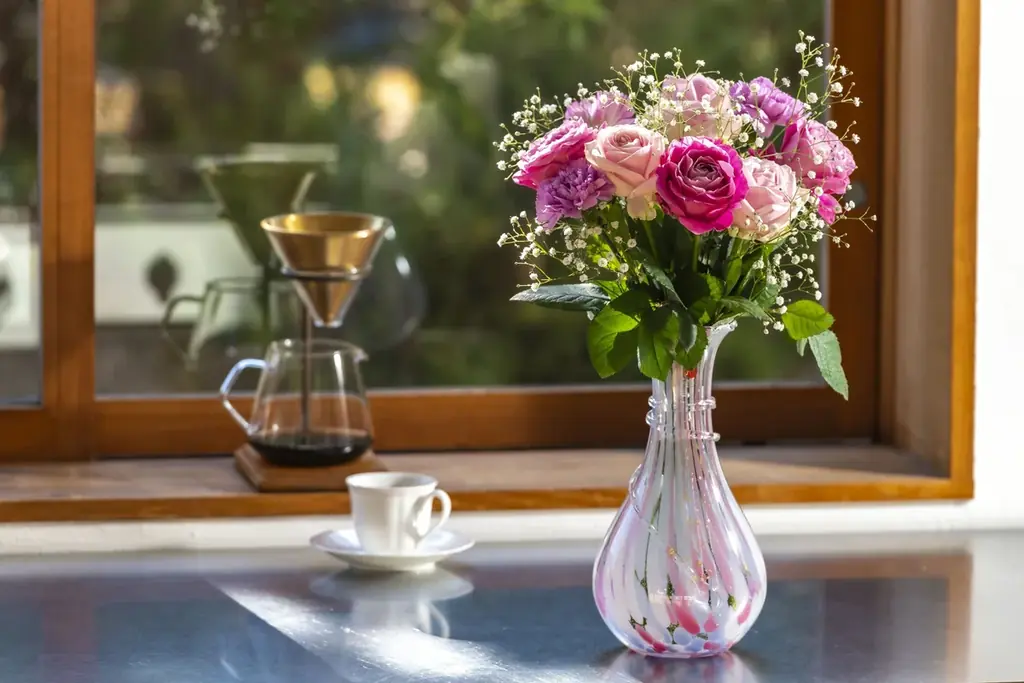 - 伝統工芸の手仕事によるガラス花器。1200度以上の高温で形づくられるため光を美しく透過する。